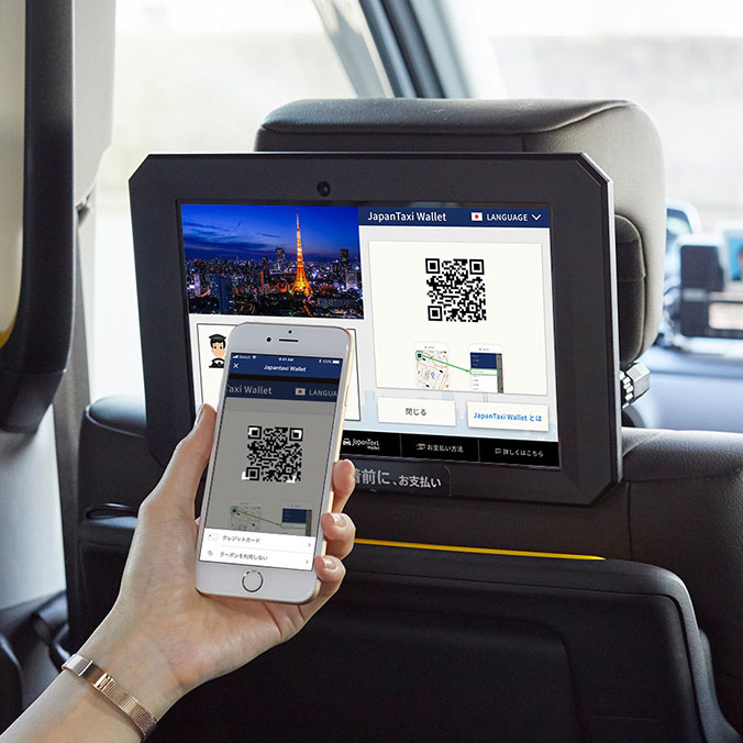 決済機を兼ね備えた後部座席設置型タブレットです。各種カードや交通系IC、電子マネーなどマルチに対応。