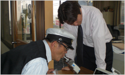 近隣警察署様にご協力いただきまして、緊急強盗対処訓練を実施しました。強盗犯人に扮した警察官2名が模擬ナイフを使用し、乗務員を脅した後、現金を奪い逃走するというものです。犯人への対処要領や、警察への110番通報について訓練を受け、同時に強盗被害に遭わないようにするための接客や心構えについても講習を受けました。